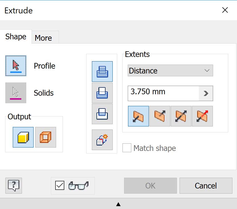 Khi lệnh Extrude được kích hoạt, một hộp thoại sẽ xuất hiện, cho phép bạn tùy chỉnh các thông số để tạo khối 3D theo ý muốn.