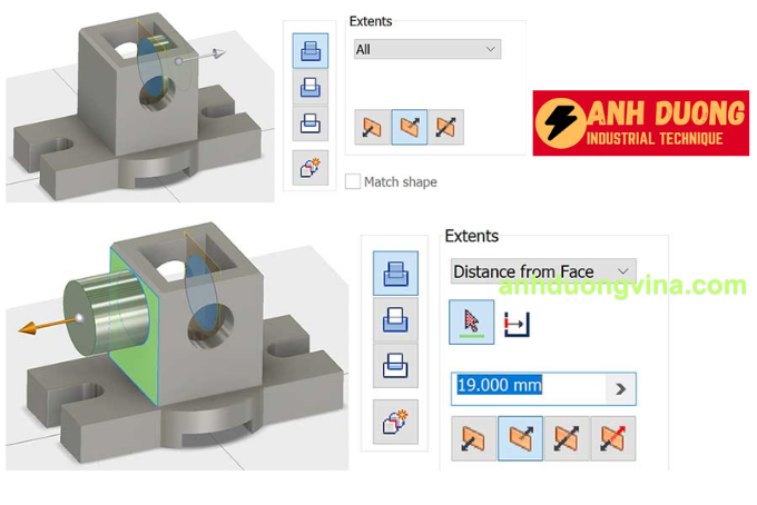 - Distance from face: Extrude có biên dạng Sketch bắt đầu từ một mặt và đùn đến một kích thước được chỉ định.