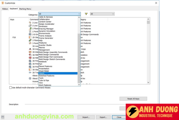 Các bước thiết lập phím tắt trong các môi trường khác như Assembly, Drawing, hay Presentation cũng tương tự. Bạn chỉ cần chọn đúng Category tương ứng và thiết lập phím tắt theo ý muốn.