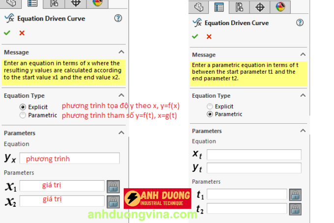 - Equation Driven Curve hỗ trợ hai dạng phương trình chính: Explicit và Parametric. Trong hướng dẫn này, chúng ta sẽ tập trung vào phương trình Explicit.