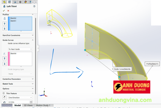 - Lựa chọn các mặt cắt (Profiles) và đường dẫn hướng (Guide Curve).