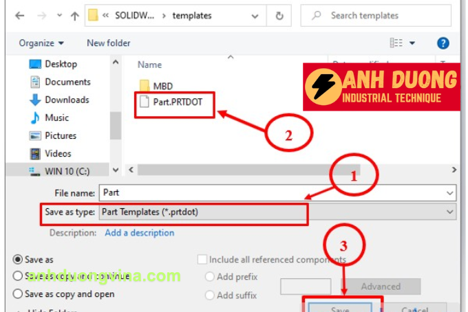 - Trong cửa sổ Save As, chọn loại file là Part Template (.prtdot).