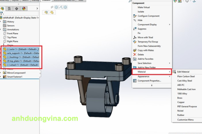 - Kiểm tra kết quả: Sau khi thay đổi vật liệu, hãy kiểm tra lại các Part trong Design Tree để đảm bảo tất cả đã được gán đúng loại vật liệu.