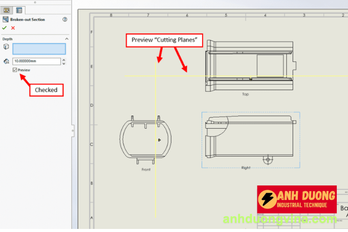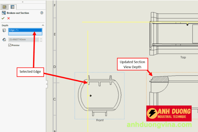 Sau khi bạn đã vẽ hồ sơ và xác định độ sâu, nhấn OK để tạo hình chiếu phần rẽ. SOLIDWORKS sẽ thêm phần rẽ vào bản vẽ của bạn, giúp bạn dễ dàng xem các chi tiết nội bộ mà không cần phải xem toàn bộ mô hình.