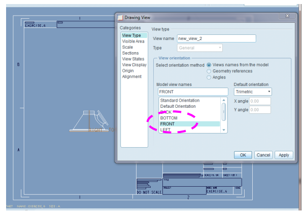 - Chọn tùy chọn “FRONT” trong hộp thoại “Drawing View”.