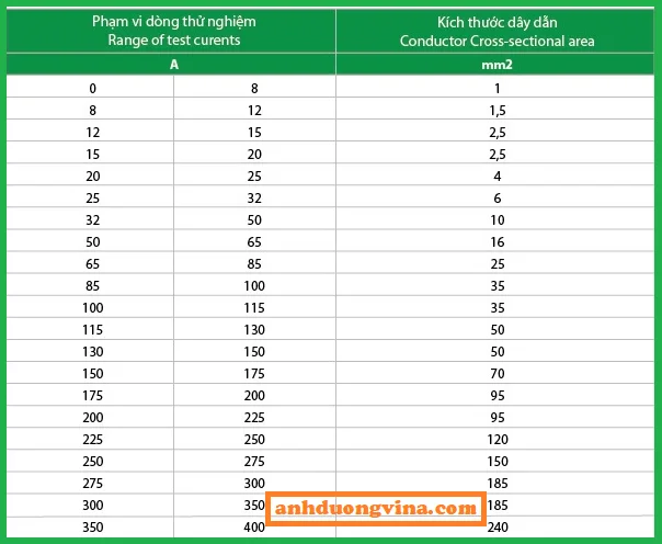 Chúng ta kết hợp AMPE trên thiết bị và bảng bên dưới để tra tiết diện dây cáp điện