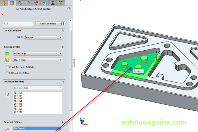 Một trong những điểm mạnh lớn nhất của SOLIDWORKS CAM là nhận dạng tính năng tự động. Khi người dùng nhập mô hình 3D vào phần mềm, SOLIDWORKS CAM tự động nhận diện các tính năng gia công như lỗ, mặt phẳng, rãnh và các tính năng khác mà không cần phải tạo đường chạy dao thủ công. Điều này tiết kiệm rất nhiều thời gian và giảm thiểu sai sót, vì phần mềm sẽ áp dụng các thông số gia công chuẩn cho các tính năng này tự động.