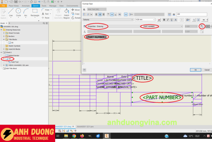 - Mở các ô thông tin trên bản vẽ để kiểm tra Part Number, Title, Author và Creation Date đã được cập nhật chính xác từ tên file.