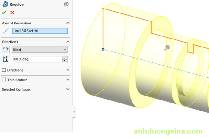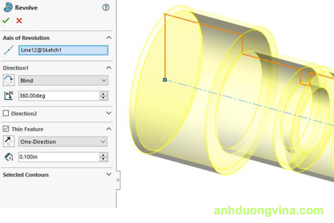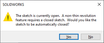 - Chọn “Có” (Yes): SOLIDWORKS sẽ tự động tạo một đối tượng đường thẳng nối các điểm cuối của hồ sơ mở, đóng kín hồ sơ và tiến hành tạo tính năng Revolve bình thường mà không phải là Thin Feature.